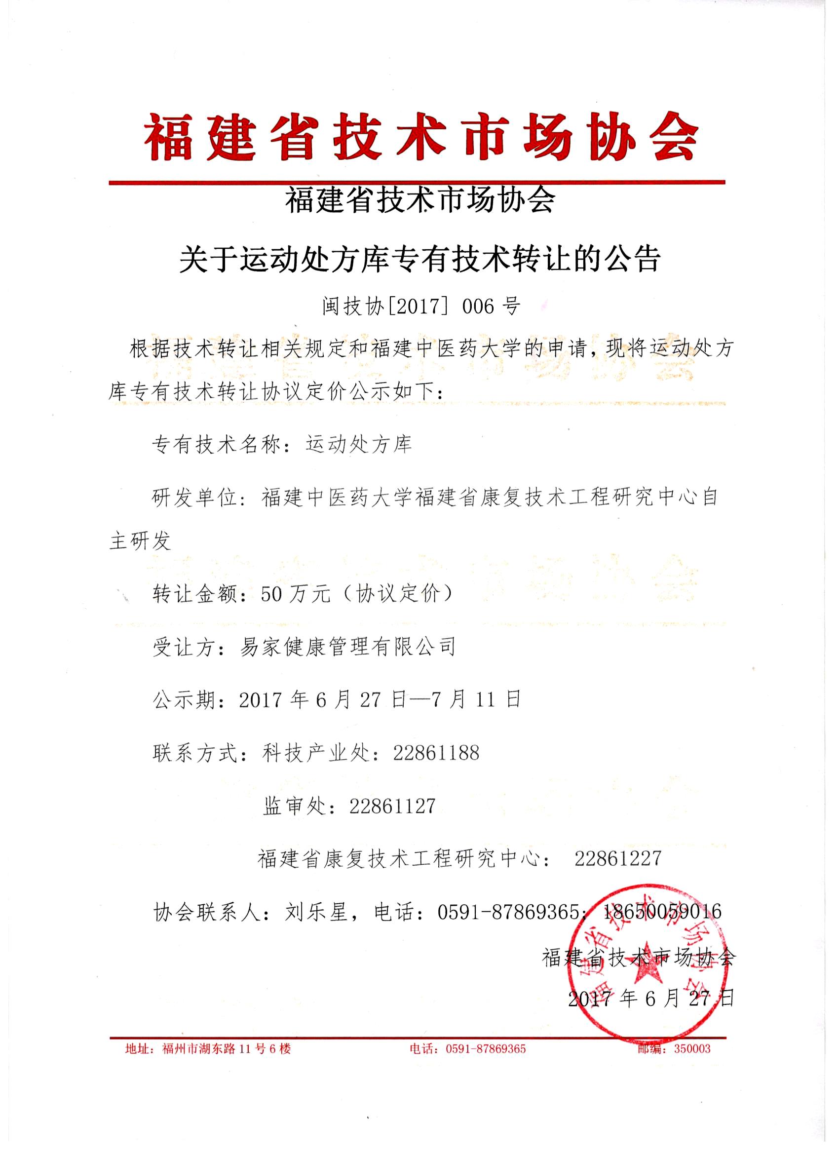 Home 协会公告 闽技协[2017]006号:福建省技术市场协会关于运动处方库专有技术转让的公告