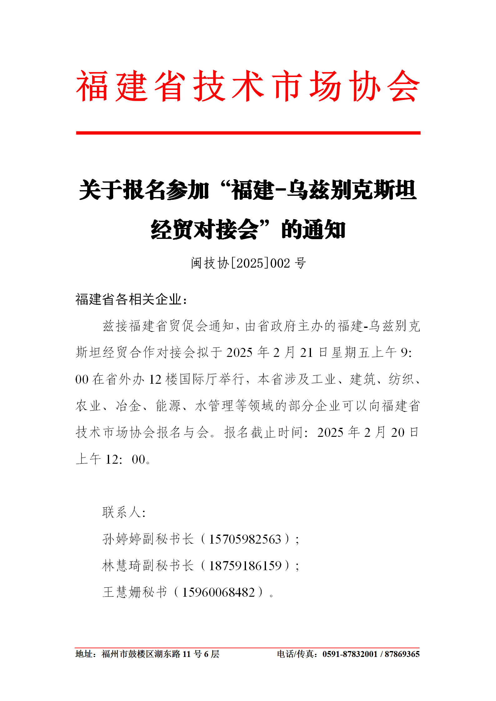 新闻动态 闽技协[2025]002号:关于报名参加“福建-乌兹别克斯坦 经贸对接会”的通知 by 会长 2025-02-18 837 附件:通知原件 相关文章 福建——乌拉圭经贸推介会 | 万恒绿园农业阮元沛参与推介 2025-06-06 福建省技术市场协会助力福建—乌拉圭经贸合作 2025-06-05 闽技协[2024]007号:关于2025年协会工作重点的通知 2024-12-09 协会领导赴长乐区讲时事受热评 2024-11-29 福建省技术市场协会茶叶出口专委会领导参加维也纳茶叶节 2024-10-21 本协负责人应邀参加日本大阪世博会福建推介会 2024-09-26